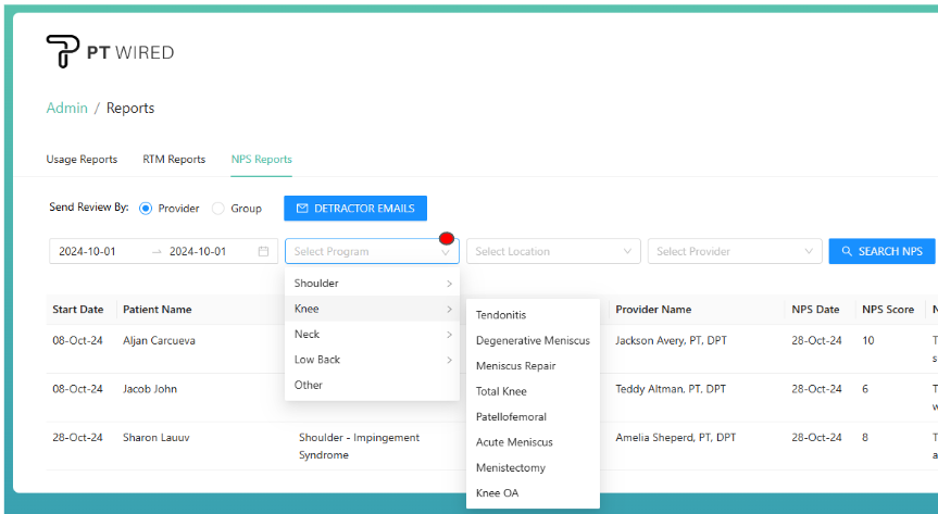 b.) Program - providers can select an option from the "Select Program" dropdown menu. We offer 5 programs in our Care Plans - shoulder, knee, neck, lower back and other.