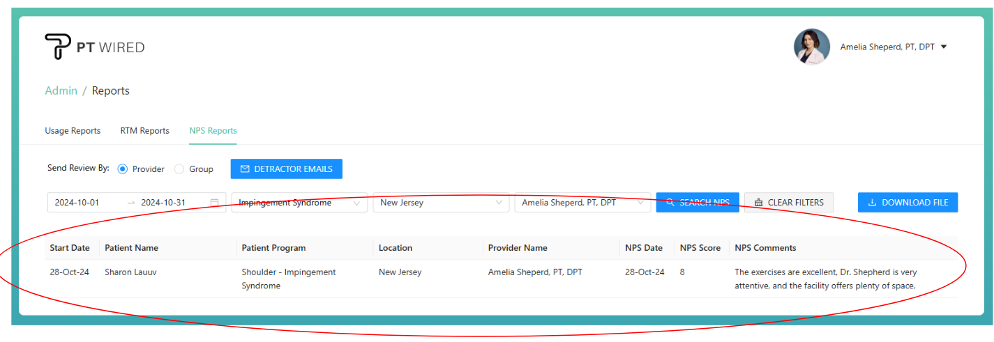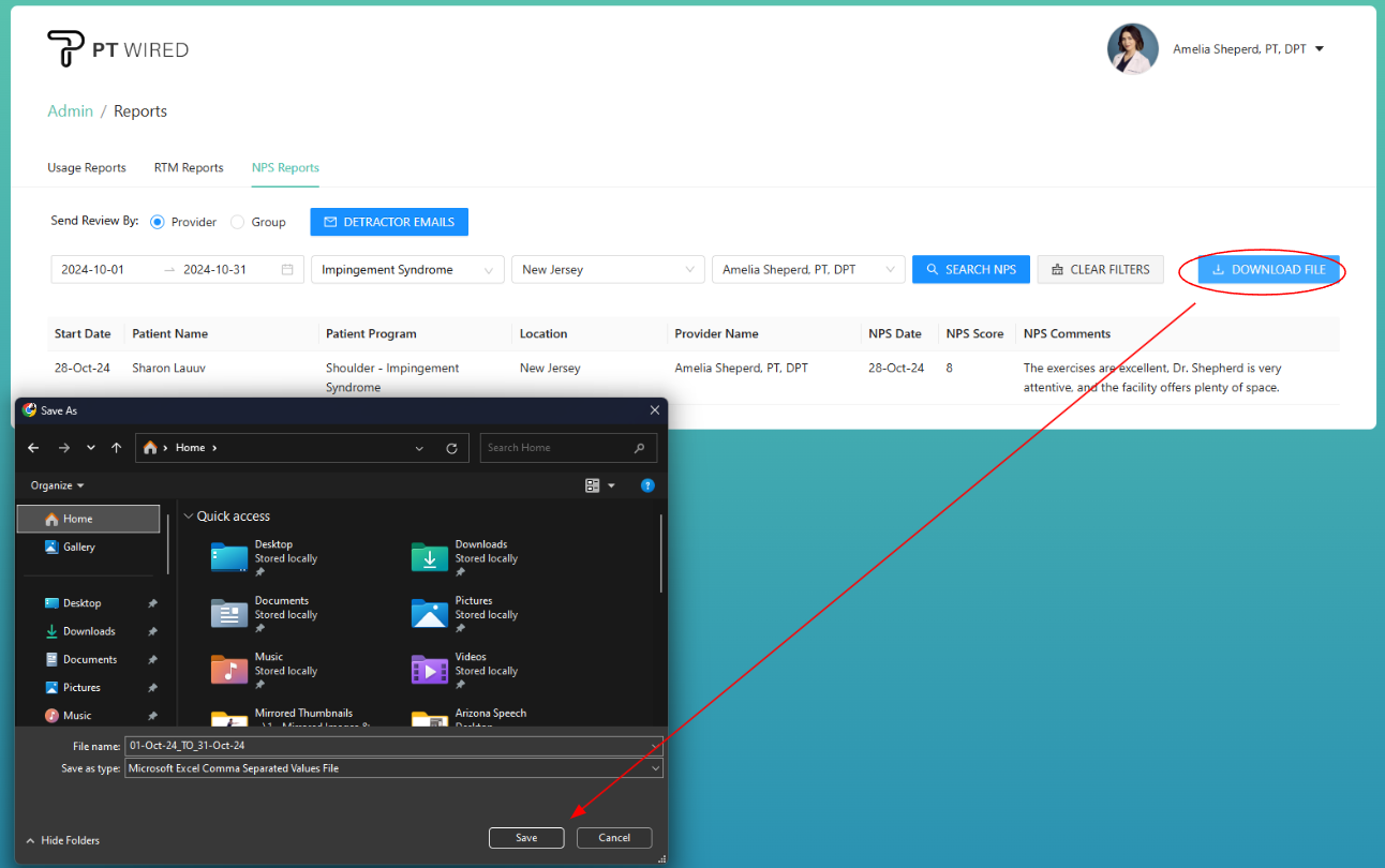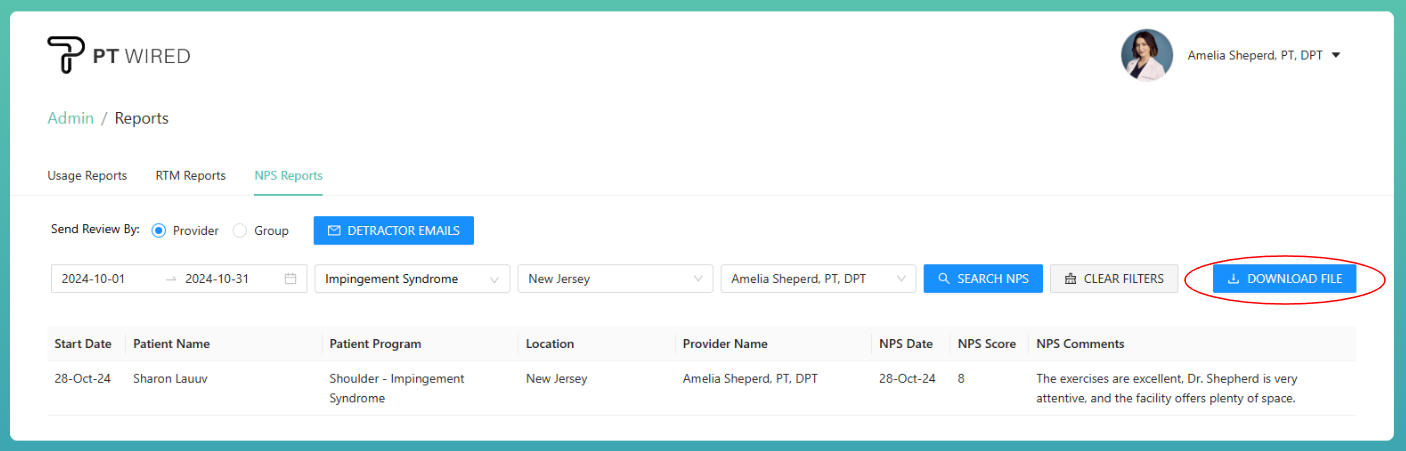 6.) Providers can download this NPS information by clicking the "Download File" button to the right of the screen. This will export the data to a .csv file which can be saved for easy reference.