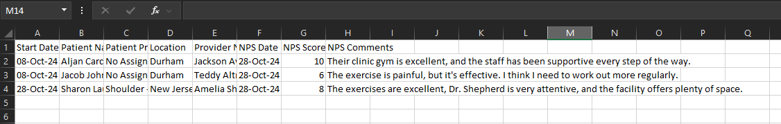 5.) The filter(s) will be applied, and any related patient NPS information will be displayed in the section below. For this example, I searched the dates from May 5th, 2023 to July 31st, 2023.