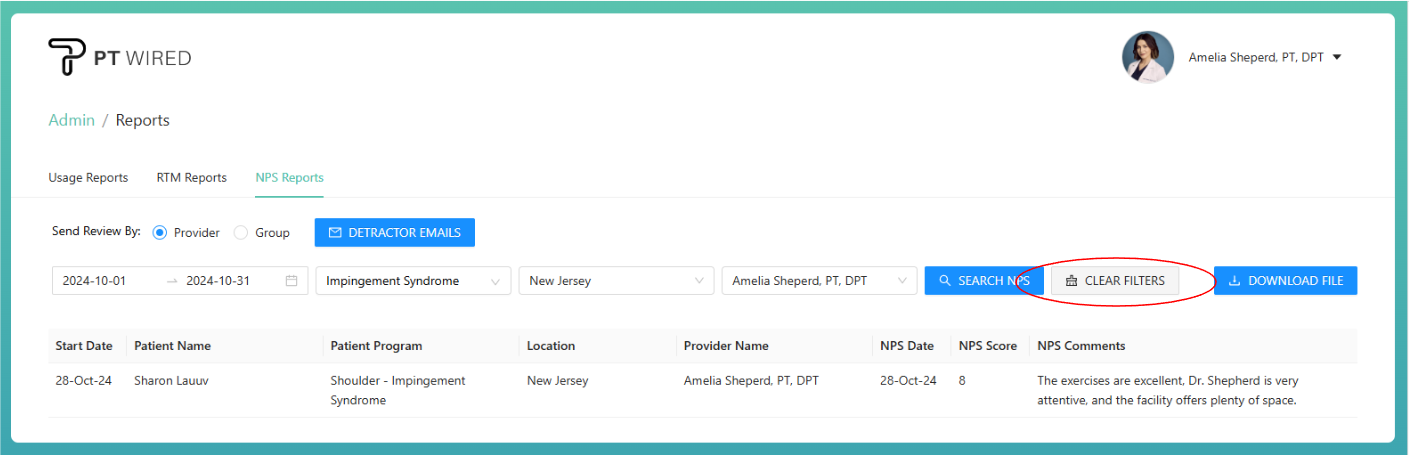 - Should you have made an error with one of the filters or you'd like to clear them, click the "Clear Filters" button next to the Search NPS filter.