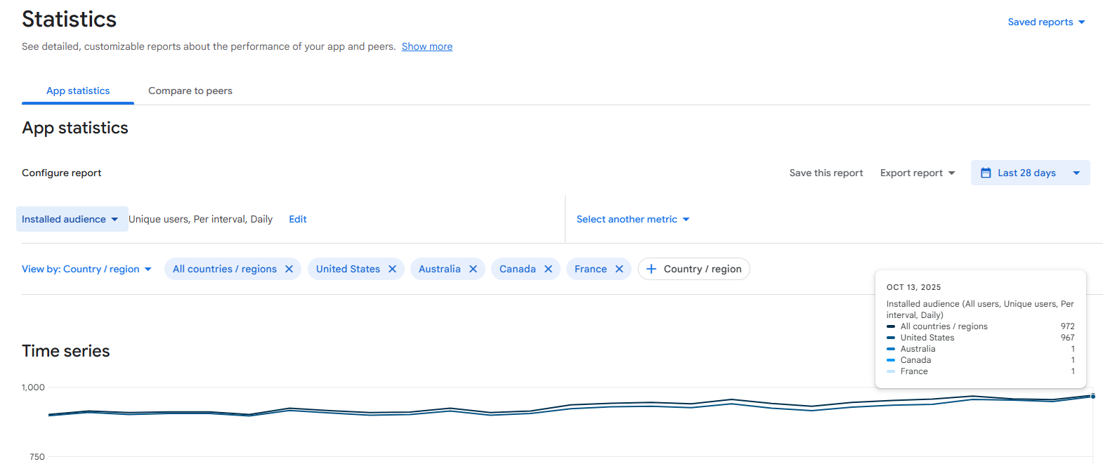 You can build your own custom reports in the Statistics tab, by selecting the metrics you want to see, you can also set a custom date range and filter the results by additional metrics such as region, Android version, device type, etc.
