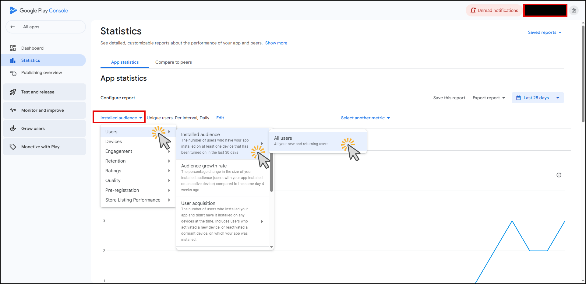 - From the Google Play Console Dashboard, you can click on the app to open the App's dashboard and click on Statistics.