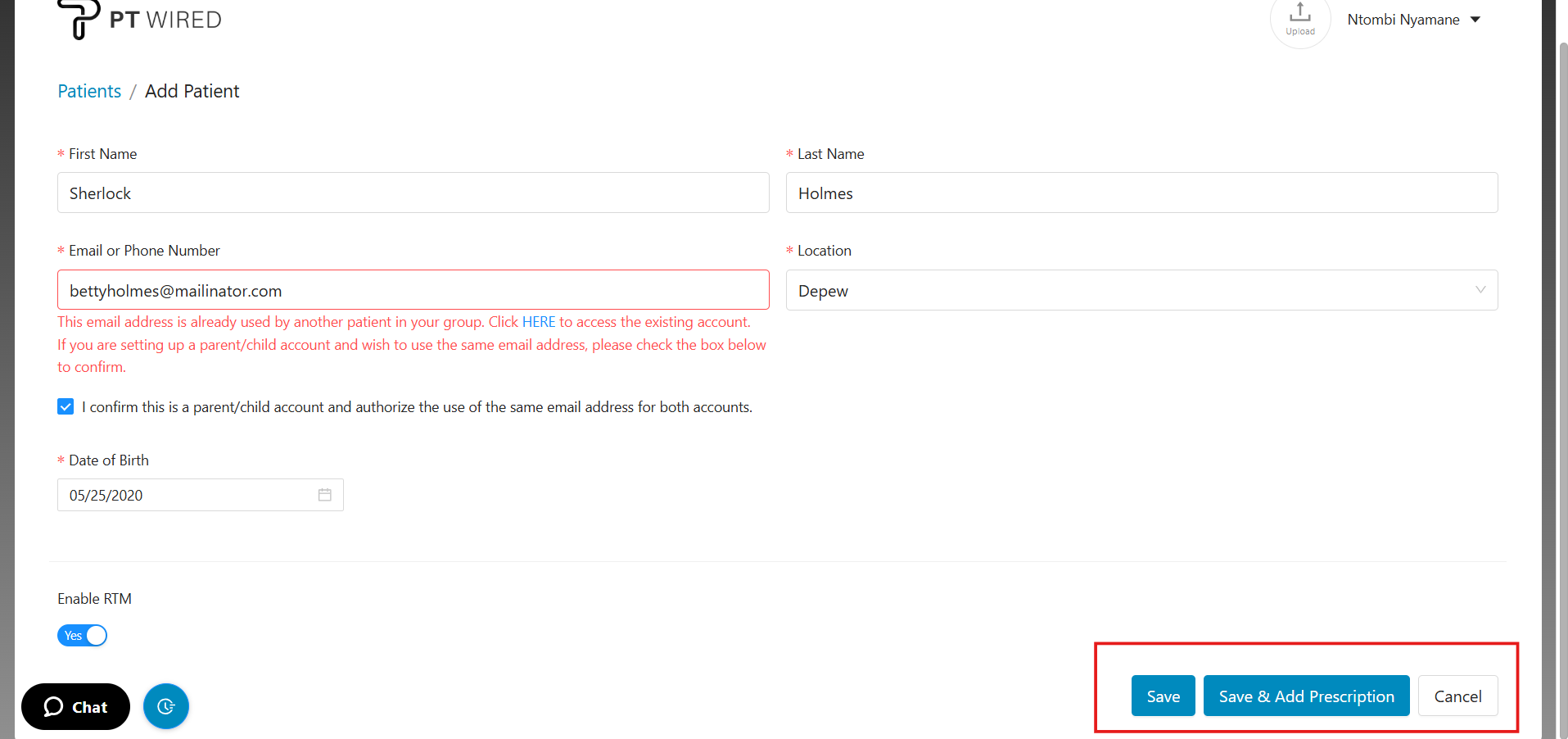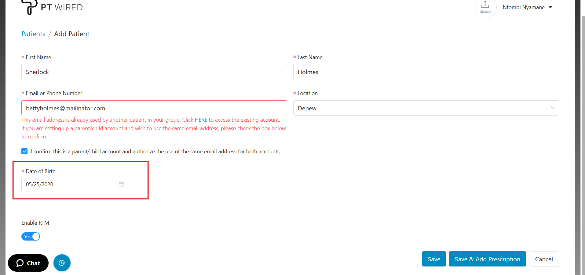 2.)You will be redirected to the patient details page. Once there, enter the patient’s information and add the email address or phone number that is already in use.