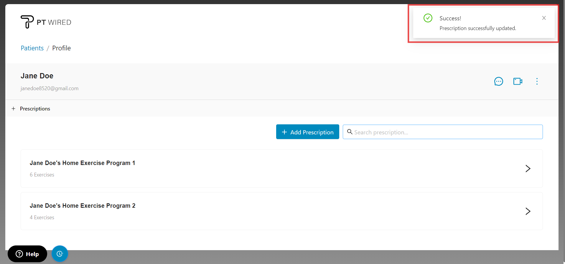 A Success! Prescription successfully updated pop-up will appear on the top right of the page once the changes to the prescription have been successfully updated.