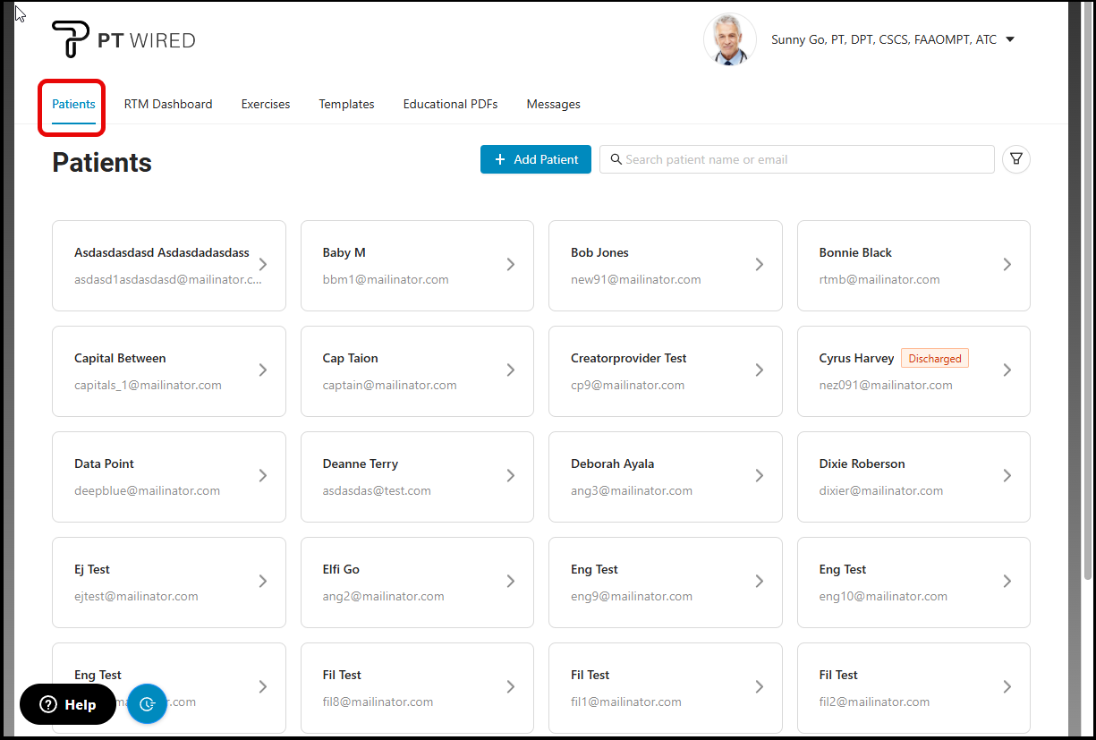 2.) Search the patient whose profile you want to edit by typing the patient's name or email address in the Search Bar. Click the patient card to go into the patient's profile page.