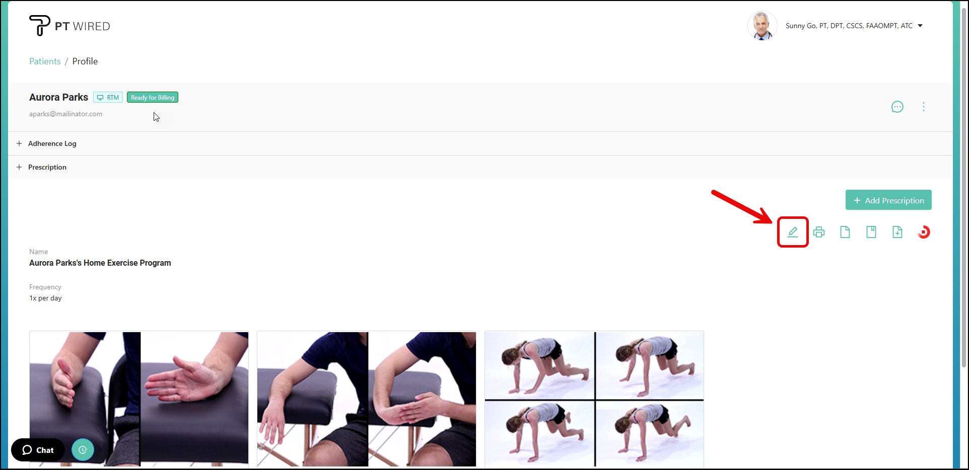 1.) Once logged in as a provider, navigate to the patient's profile you wish to edit. Under the "Prescription" bar, click the "Edit Prescription" icon, symbolized by a blue pencil.