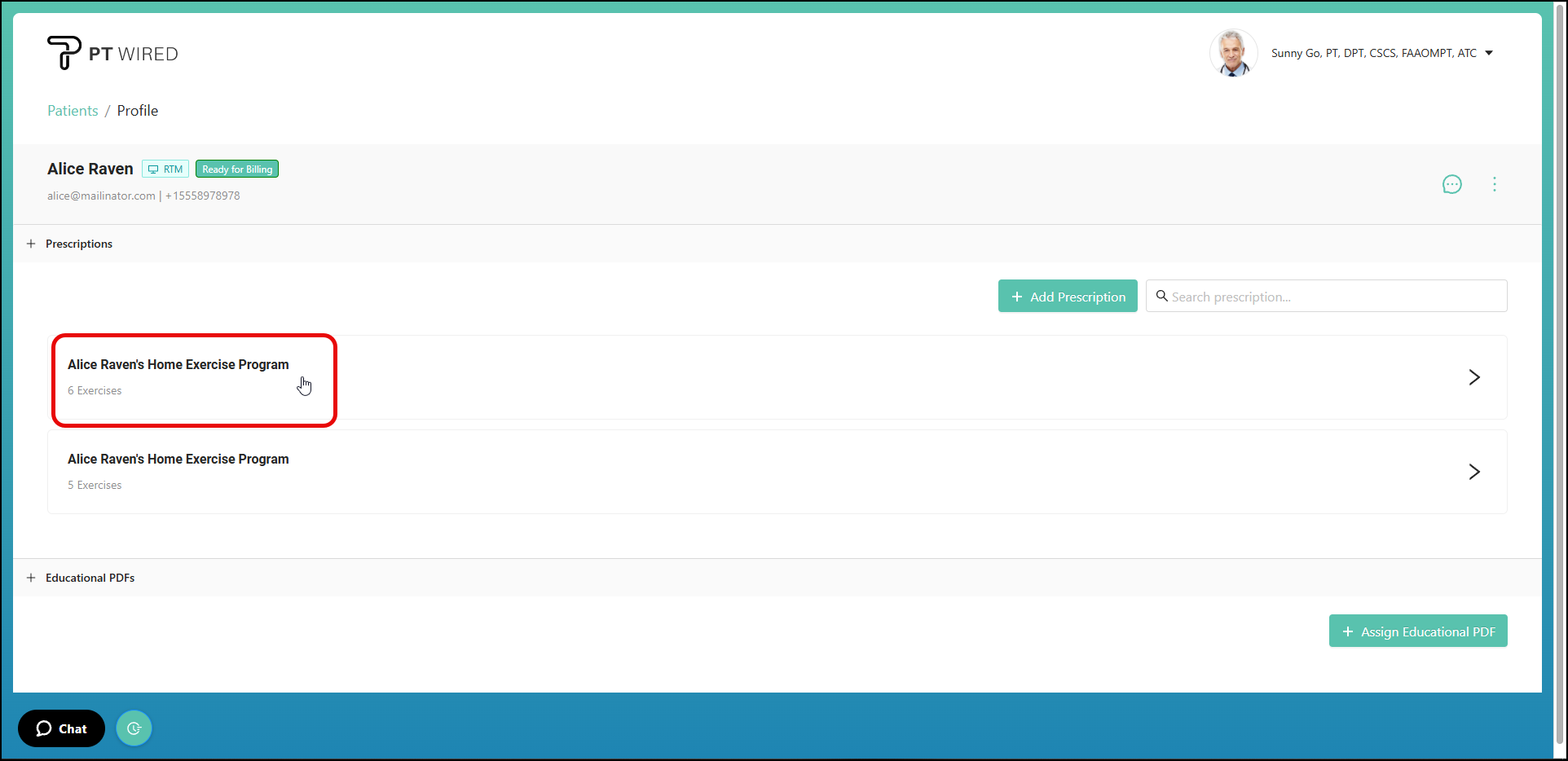 8.) A Success! Prescription successfully updated pop-up will appear on the top right of the page. The system will automatically notify the patient via email advising them of a new/updated exercise program.