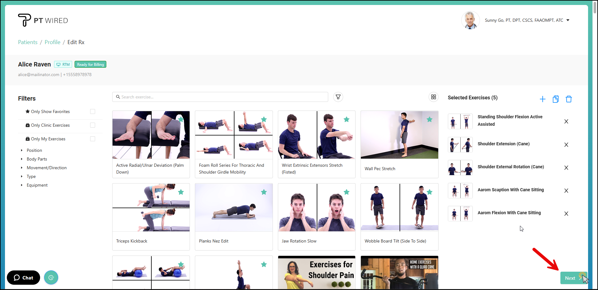 2.) By clicking the "Next" button on the lower right side of the page, you will be directed to the "Exercise Selection" page.