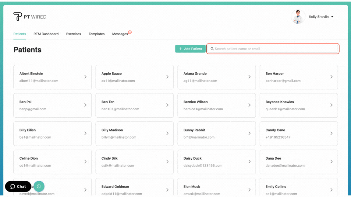 2.) On this page you're able to search for a specific patient by making use of the search bar on the top right of the page. Click the patient card to go to the patient's profile.