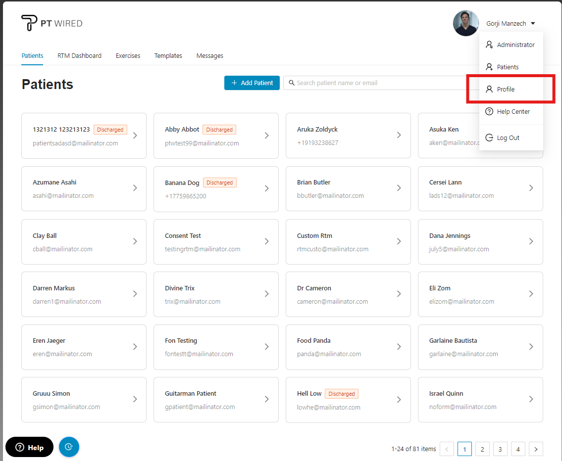 1. Log in to the system as an Admin or Therapist. Click your name on the upper right-hand corner to view the drop-down menu and select "Profile."