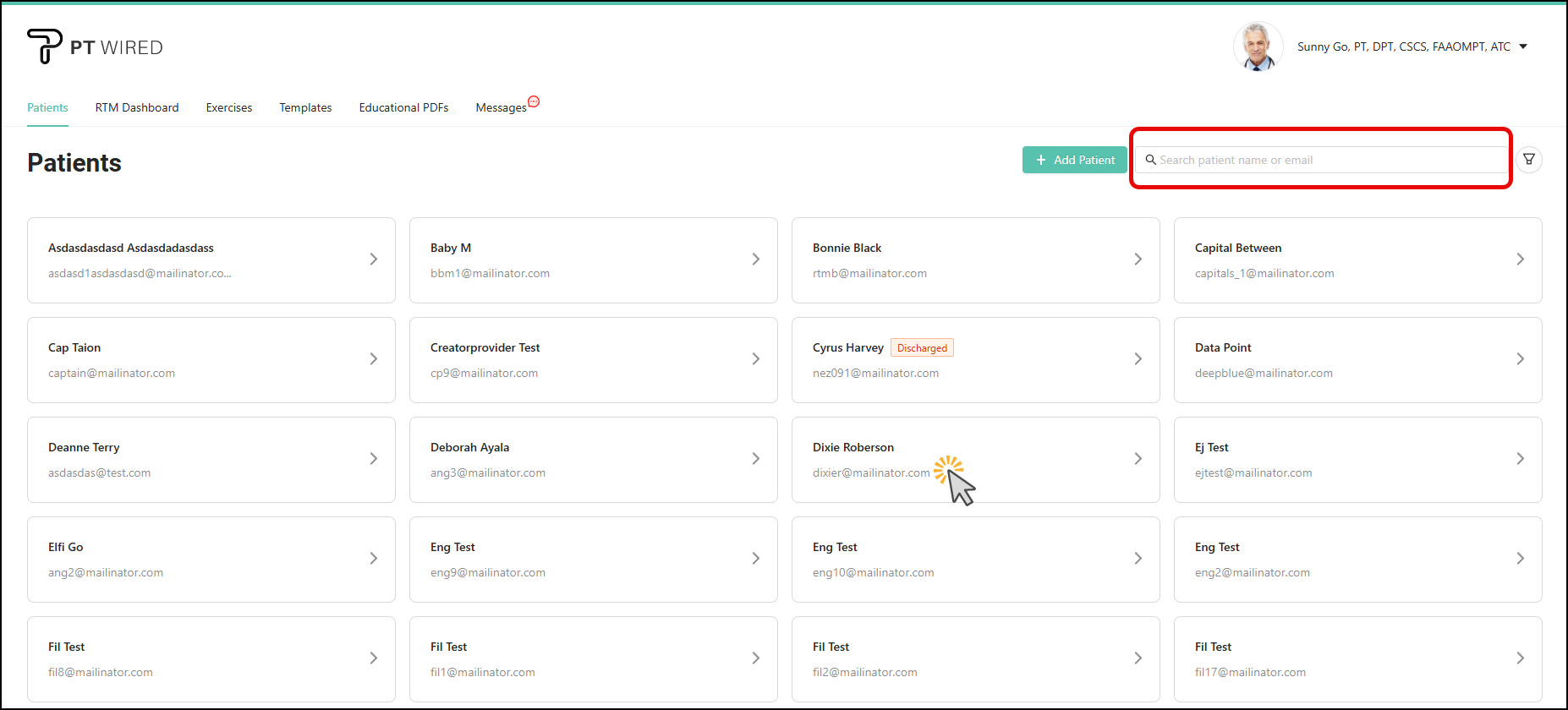 2.) Once logged in, you’ll be directed to the “Patients” page. From here, you can either select a patient from your list, or search for a specific patient by name or email by making use of the search bar to the left of the page. Click the patient card to navigate to the patient’s profile.