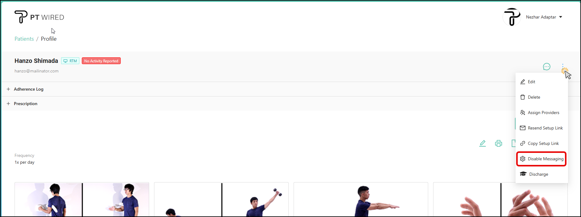 3.) Once in the patient’s profile, navigate to the far right of the page and click the three dots. A dropdown menu will be displayed - click the “Disable Messaging” button.