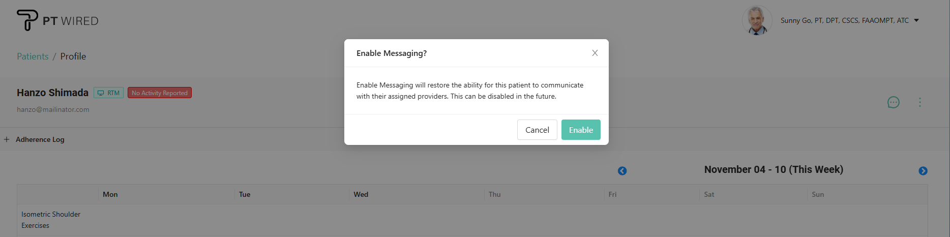 An “Enable Messaging” pop-up will appear. Click “Enable” to restore the patient’s ability to communicate with their assigned providers.