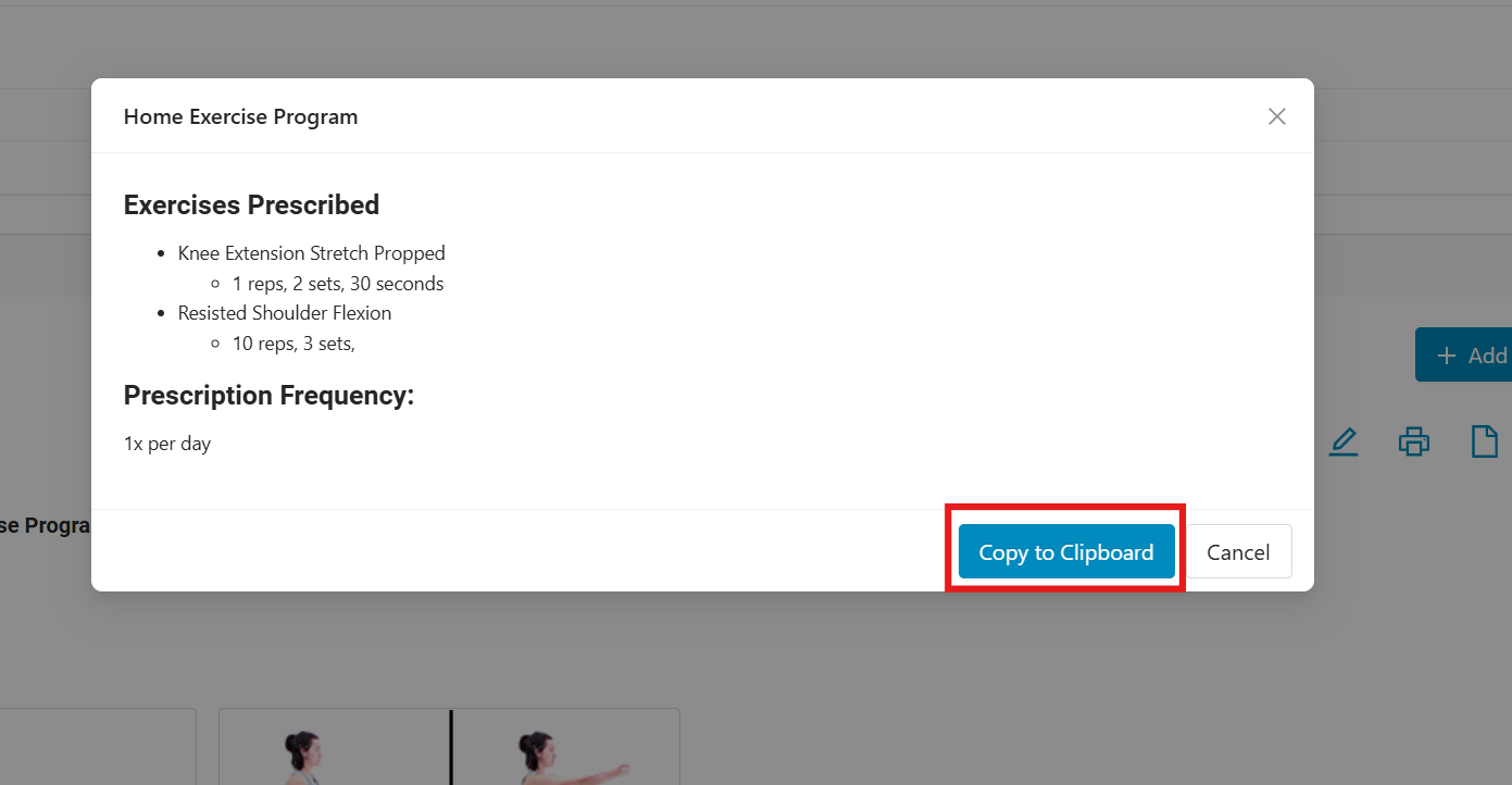 4.) After clicking the Document button, a pop-up summary of the patient's home exercise program will appear. Click the "Copy to Clipboard" button on the bottom right of the pop-up to copy the summary.