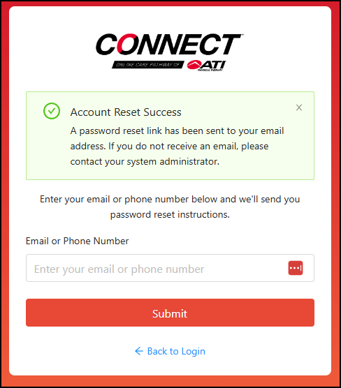 3.) You'll receive a success prompt informing you that an email with a link to reset your password has been sent to your email address provided.