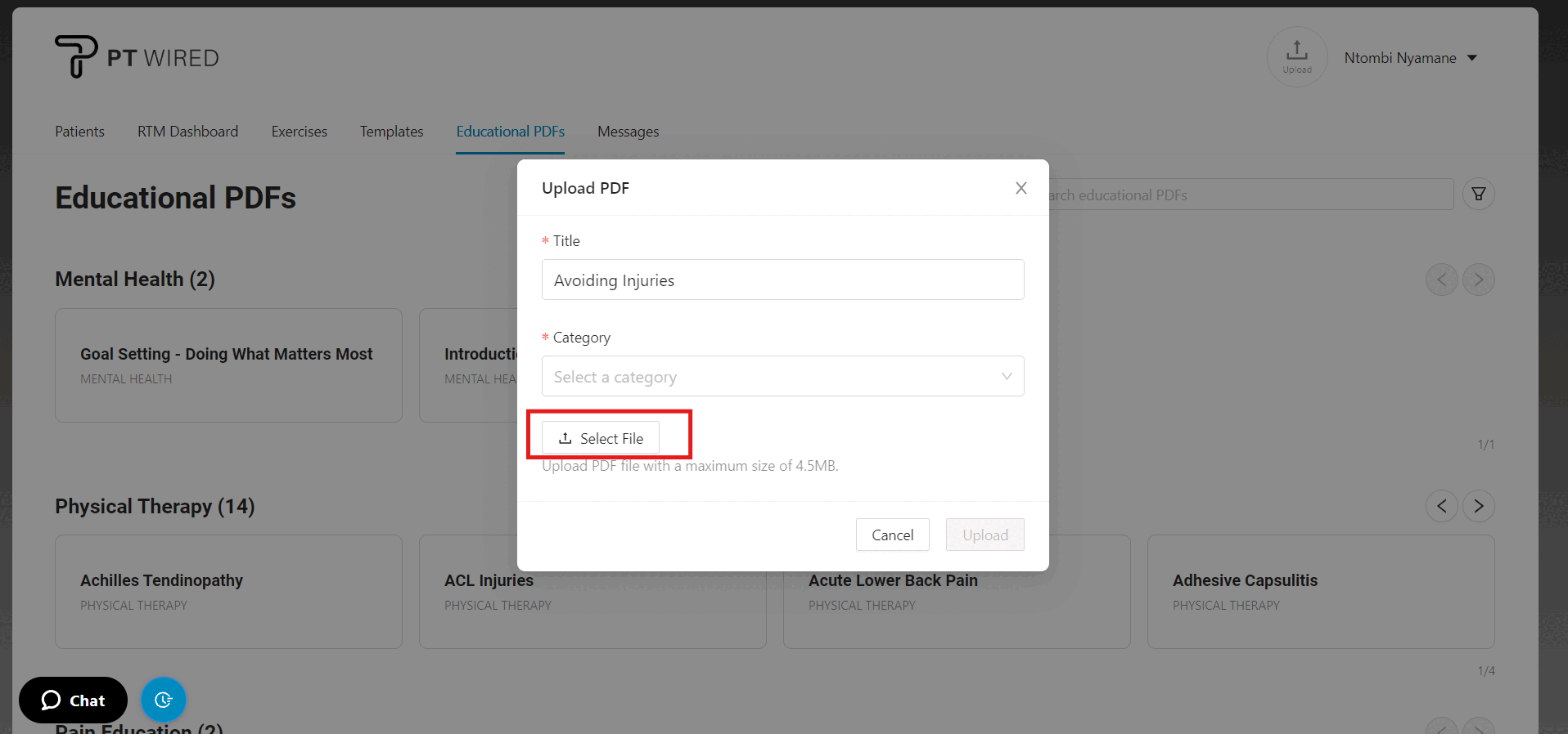 3. The 'Upload PDF' box will pop up and you can add the title of the PDF and the select the category.