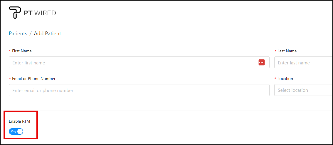 • When adding patients from now on, the RTM Status toggle will then be gray (disabled.)