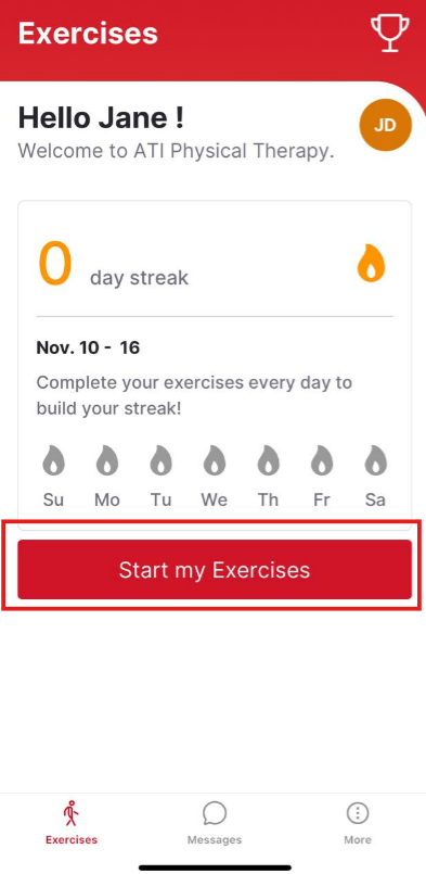 1.) Once you've logged into the branded app, you'll be on the "Home" page (Start Your Exercises). Click the "Start Your Exercises" button to view your assigned prescriptions.