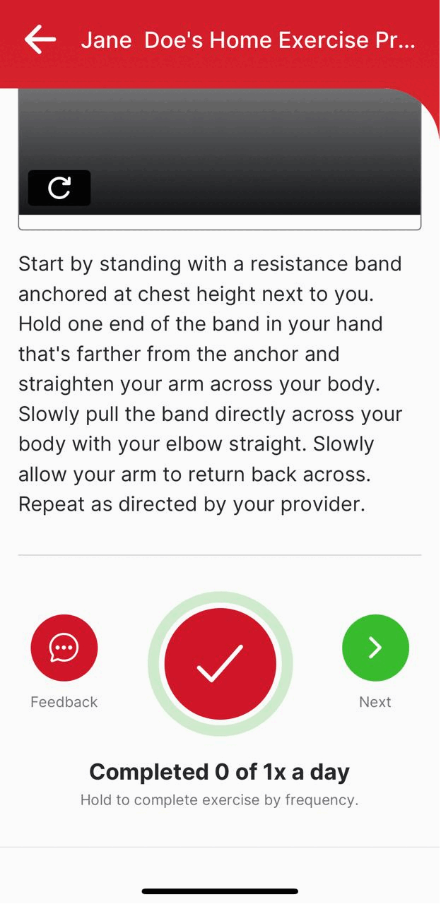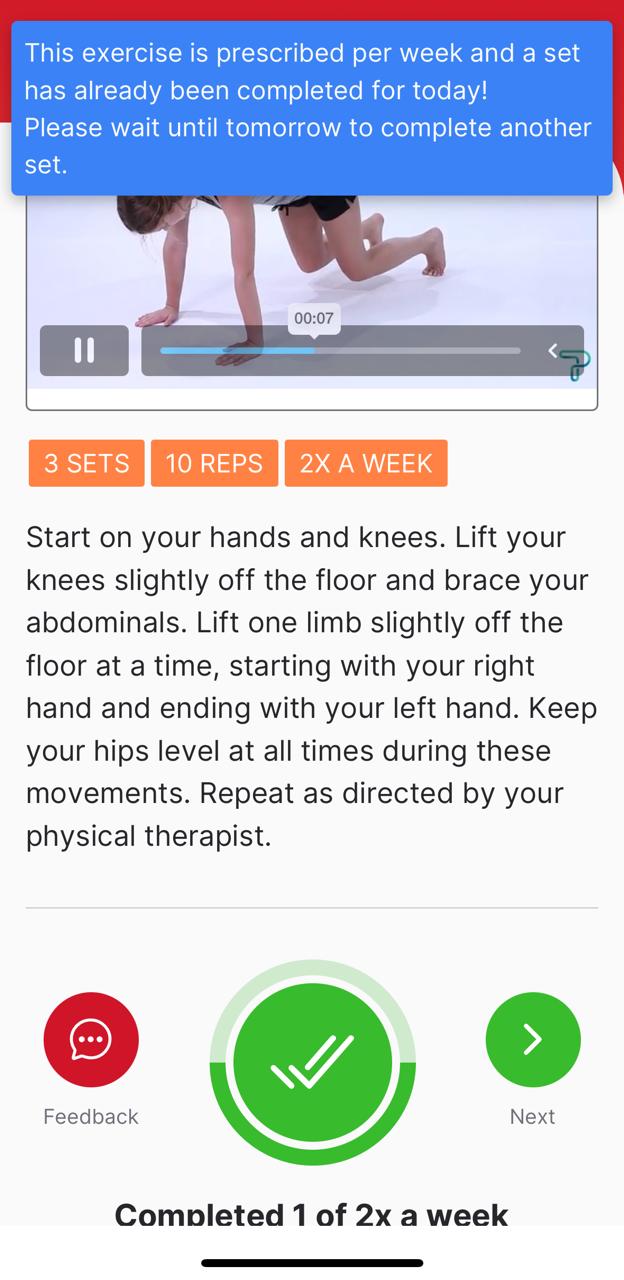 6.) For exercises with a weekly/monthly frequency, once the exercise has been completed for the day, you will not be able to complete it again until the following day/week/month. If there is an attempt to complete the exercise again within the same day/cycle, an alert (Please wait until tomorrow to complete another set) will pop up notifying you that the exercise has already been completed.