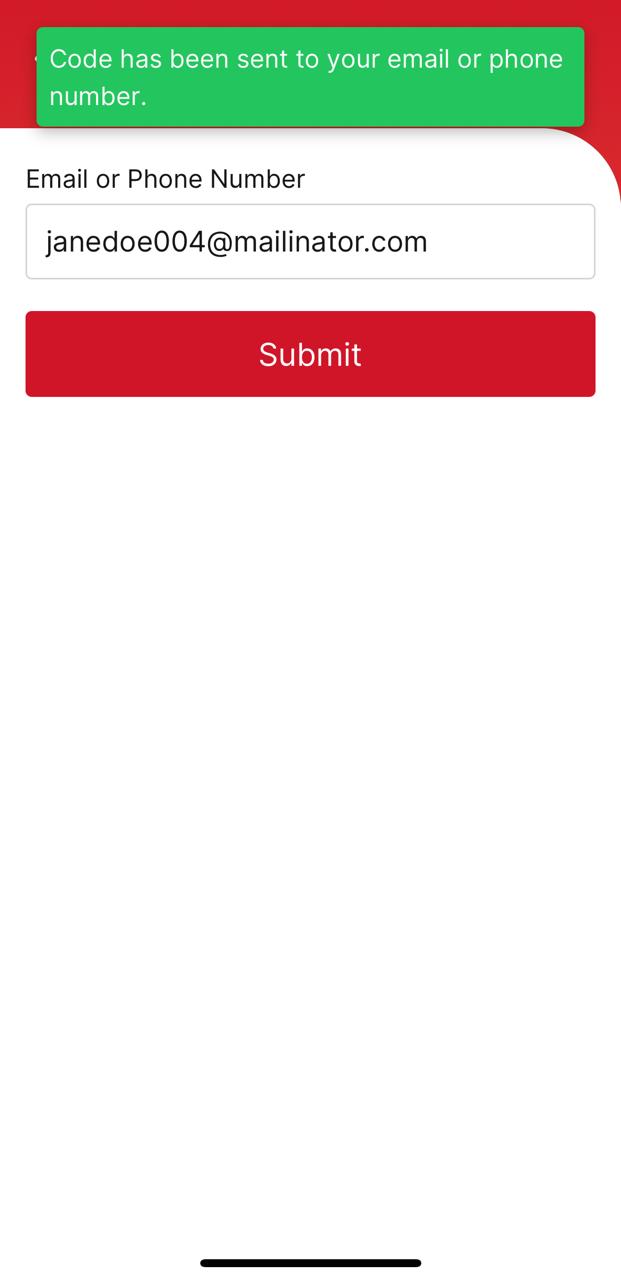 2.) You'll receive a "Code has been sent to your email or phone number" message informing you that a link to reset your password has been issued to your email address or phone number provided above.