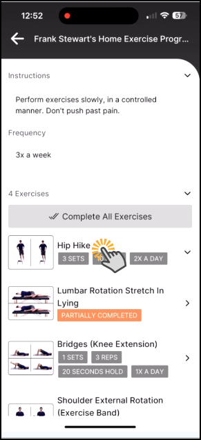1. Login as a patient to the mobile app. From the 'Exercises' page, tap on 'Start my Exercises'.