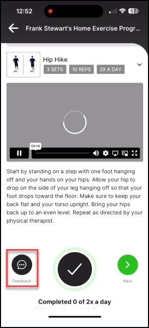 Patients can now provide feedback on all exercises listed in their prescription. The feedback will be received by their provider as a message.